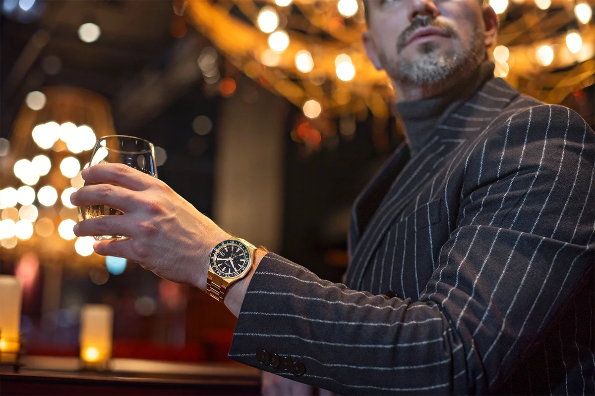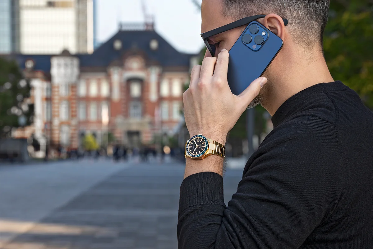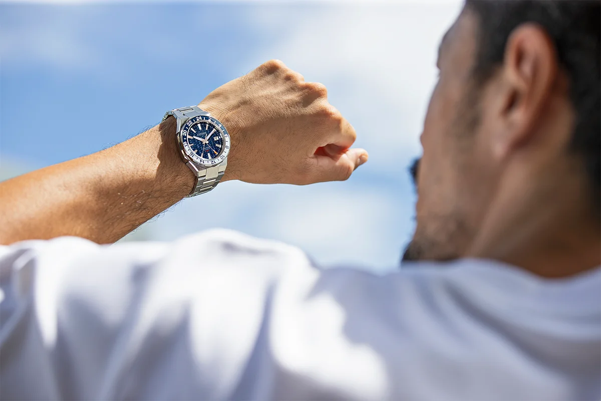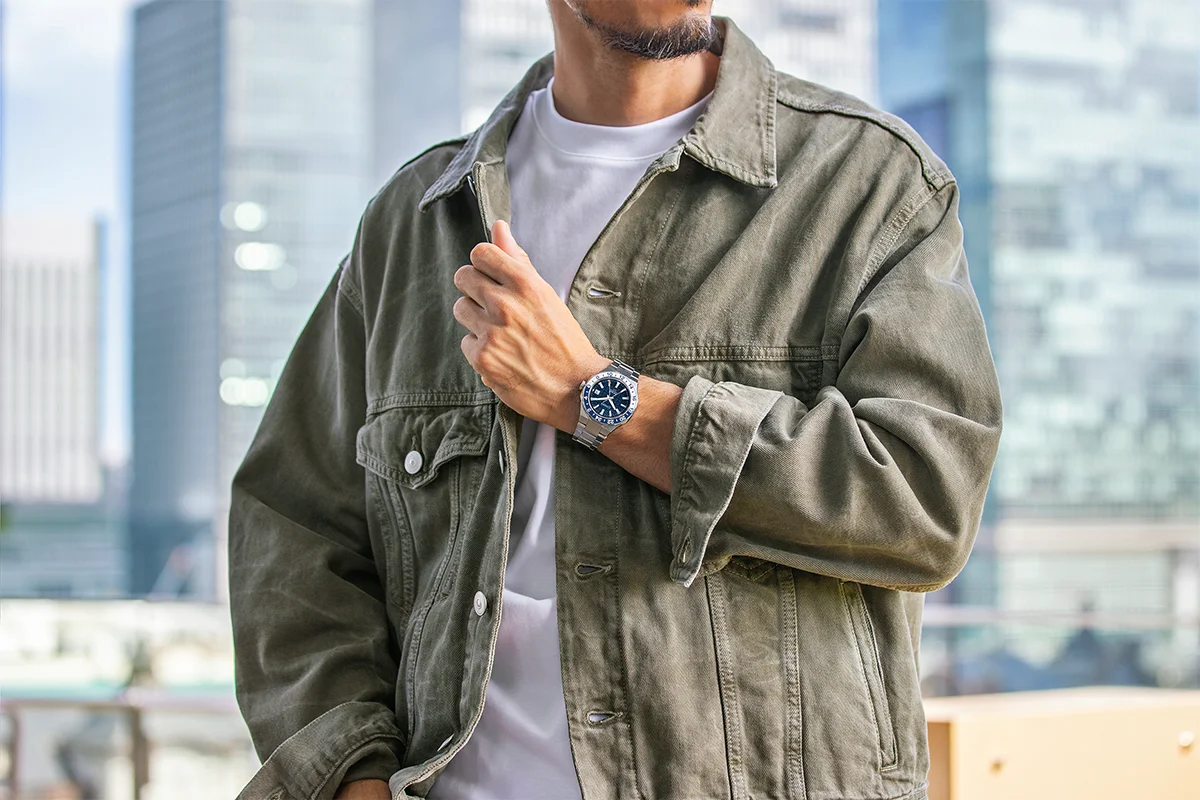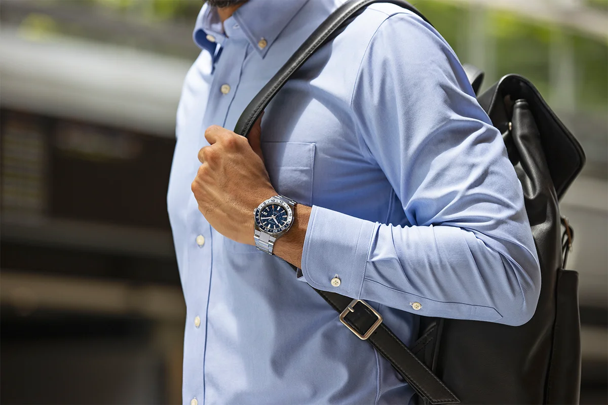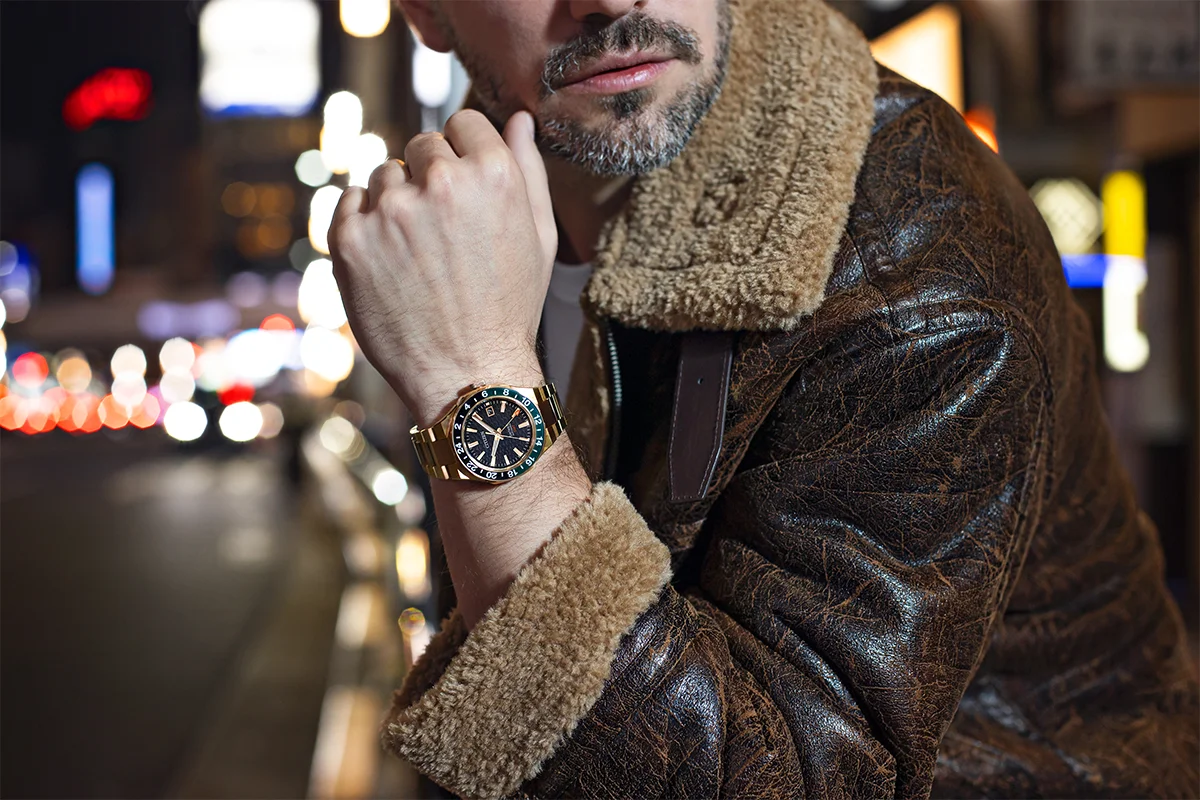 Model equipped with Cal. 9054 mechanical GMT movement keeps precise time in sync with users who operate on a global stage.