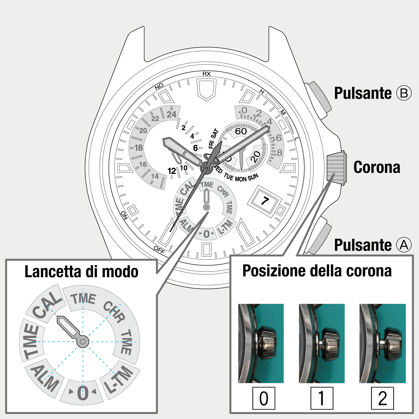 Girare la corona in modo che la lancetta della modalità sia rivolta verso il nome della modalità in modo sicuro.