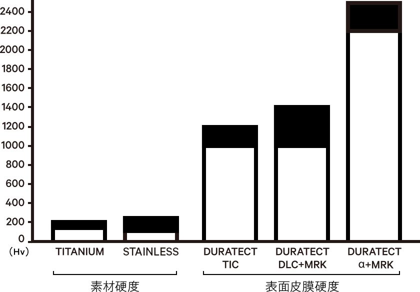 F900のケースやバンドにはスーパーチタニウム™(硬度:Hv1,000 -)の中でも最高レベルの仕様を採用。ガス硬化技術であるデュラテクトMRKと表面硬化技術(デュラテクトDLCおよびデュラテクトα)の組み合わせによって、さらなる高硬度を実現しました。