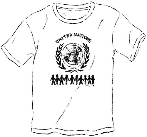 正在冥思苦想之际,我巧遇了在同层办公的CSR部门的一位女同事,身穿了一件带有联合国标志的T恤。