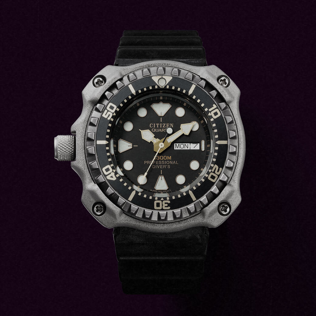 Le cadran noir rappelle volontairement la Professional Diver de 1982. La robustesse du boîtier, conjuguée à la solidité de la lunette rotative, ornée de cannelures profondes, leur confère une apparence forte et distinctive. Le boîtier a reçu la même finition brute rugueuse que le modèle original pour obtenir une sensation unique au touché. Le Super Titanium™ recouvert de Duratect MRK est appliqué sur le boîtier afin d’améliorer la résistance.