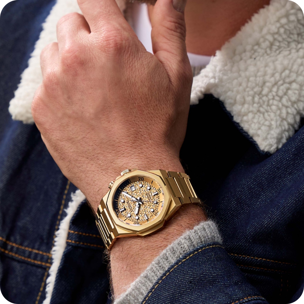 銀色錶盤綴飾幾何圖案,