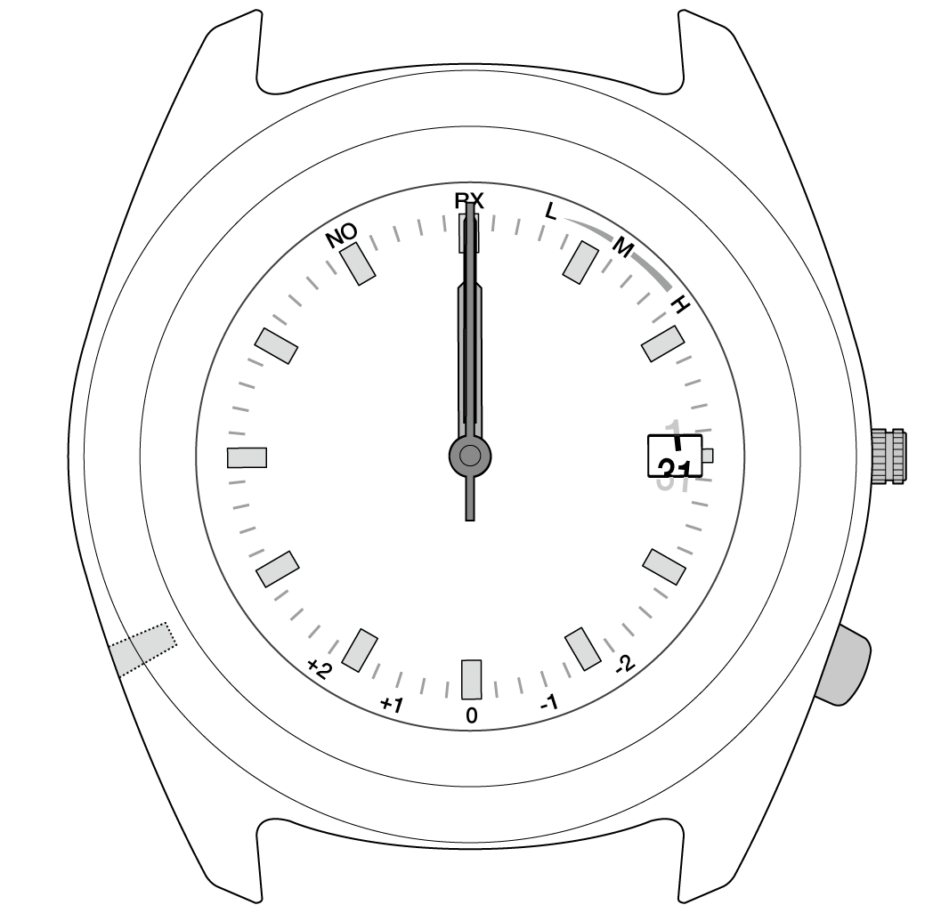 - Rotate the crown to adjust the hour hand and the date indication to the correct reference position.