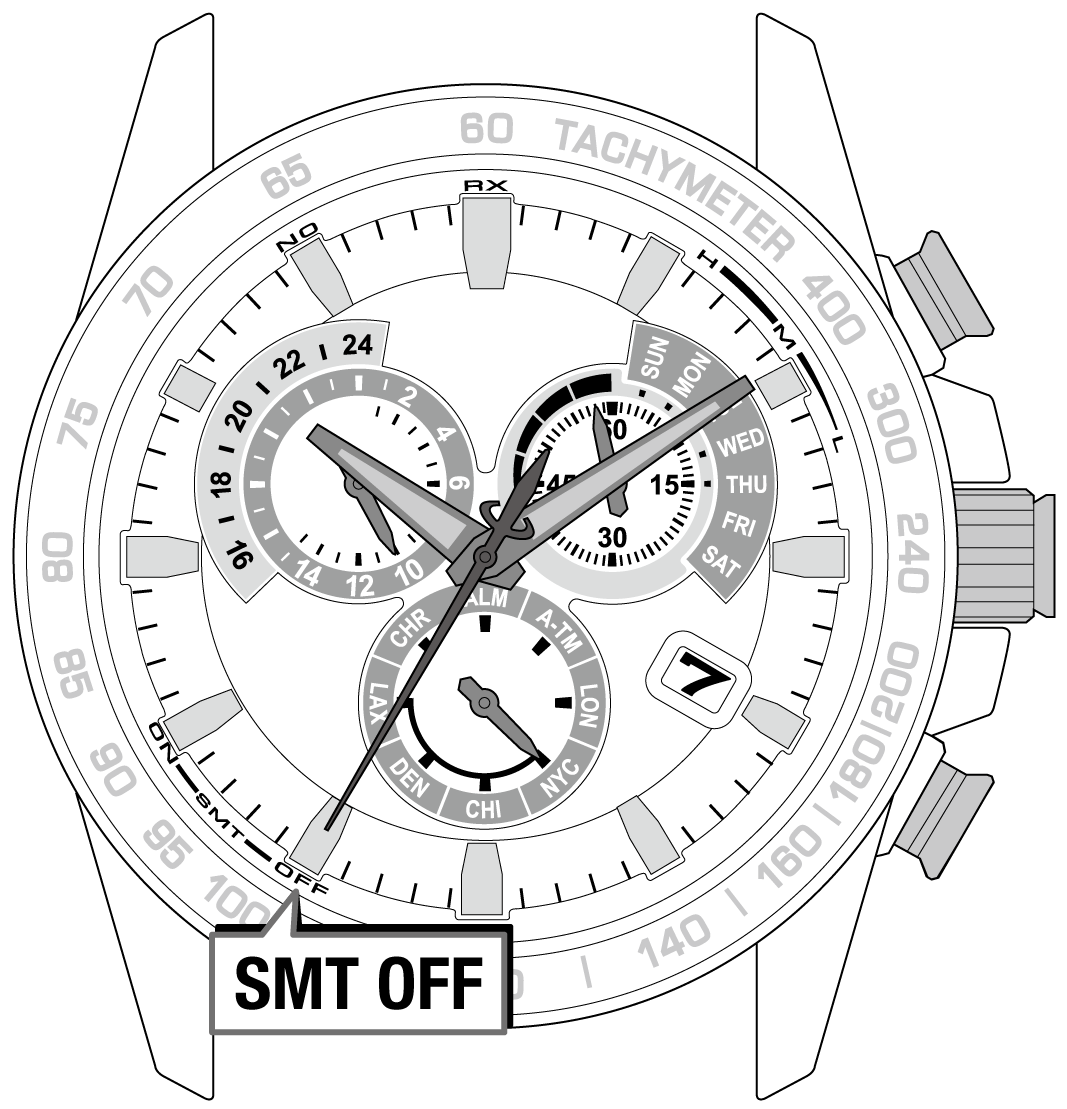 - Rotate the crown to change the mode to any one of the following: [LON], [NYC], [CHI],[DEN], [LAX] or [A-TM].