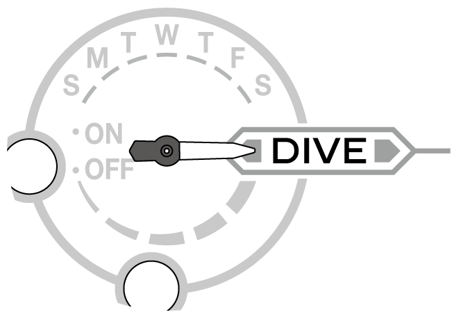 The hands temporarily show 0:00:00, then the function hands points “DIVE” and the watch turns into the diving mode.