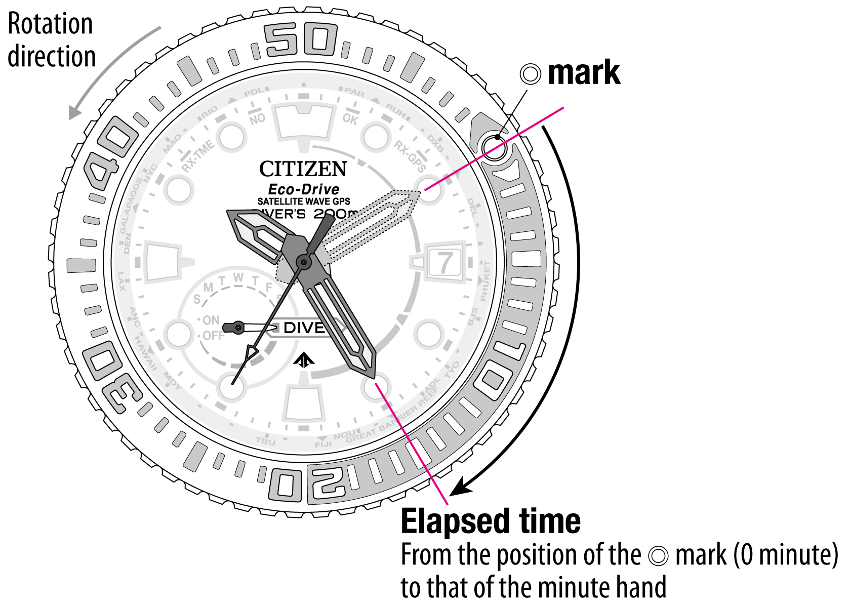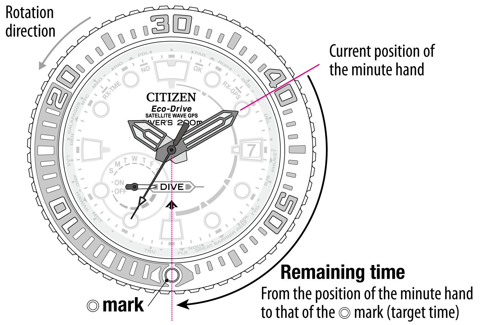 - Rotate the rotating bezel to set the ◎ mark to the current position of the minute hand.