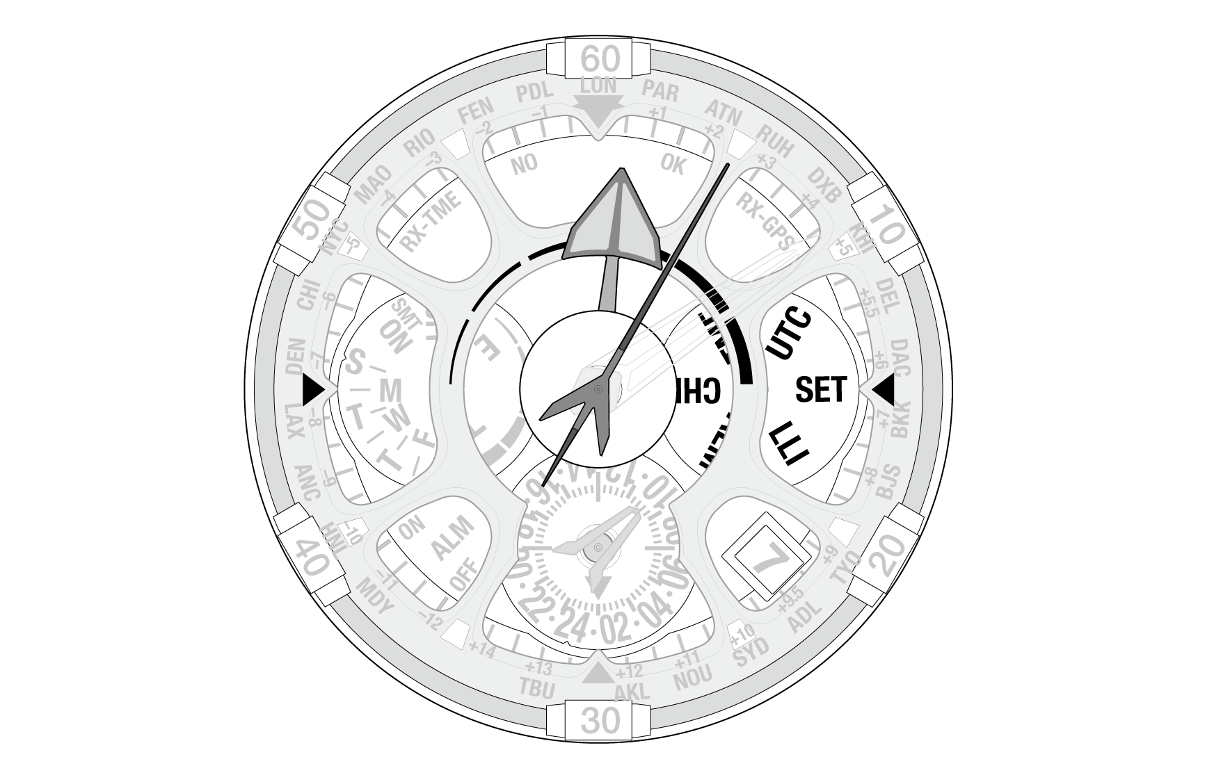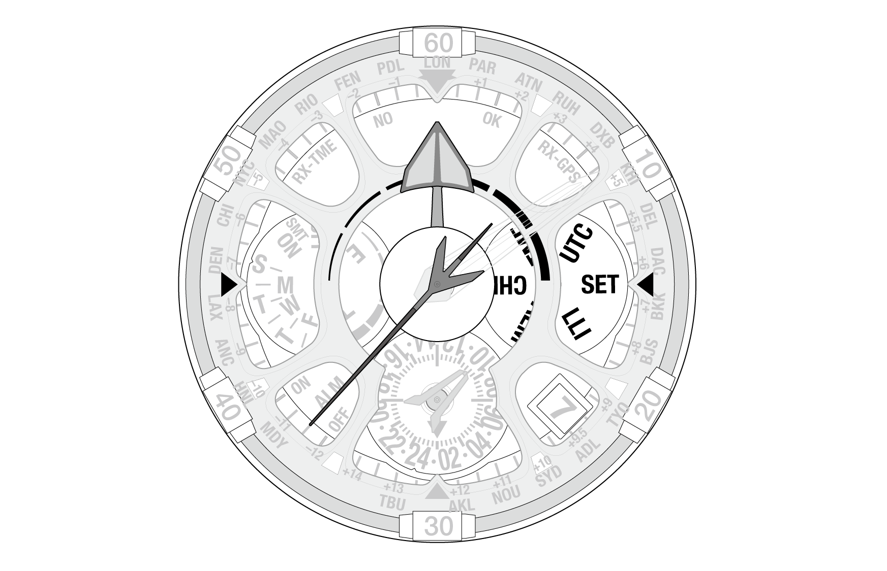 Using the “0:00:00” position as the starting point, the minute and second hands indicate the leap second setting.