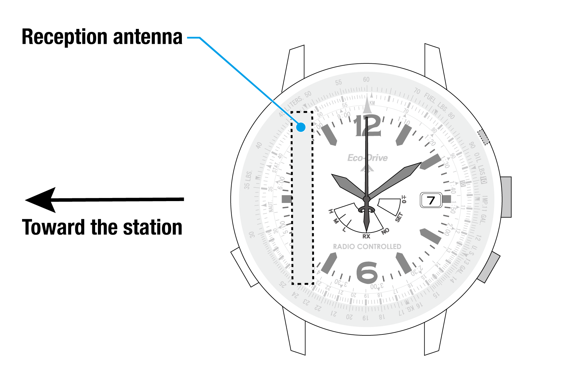 Place the watch with the 9:00 position facing toward the station. - Do not move the watch during time signal reception.