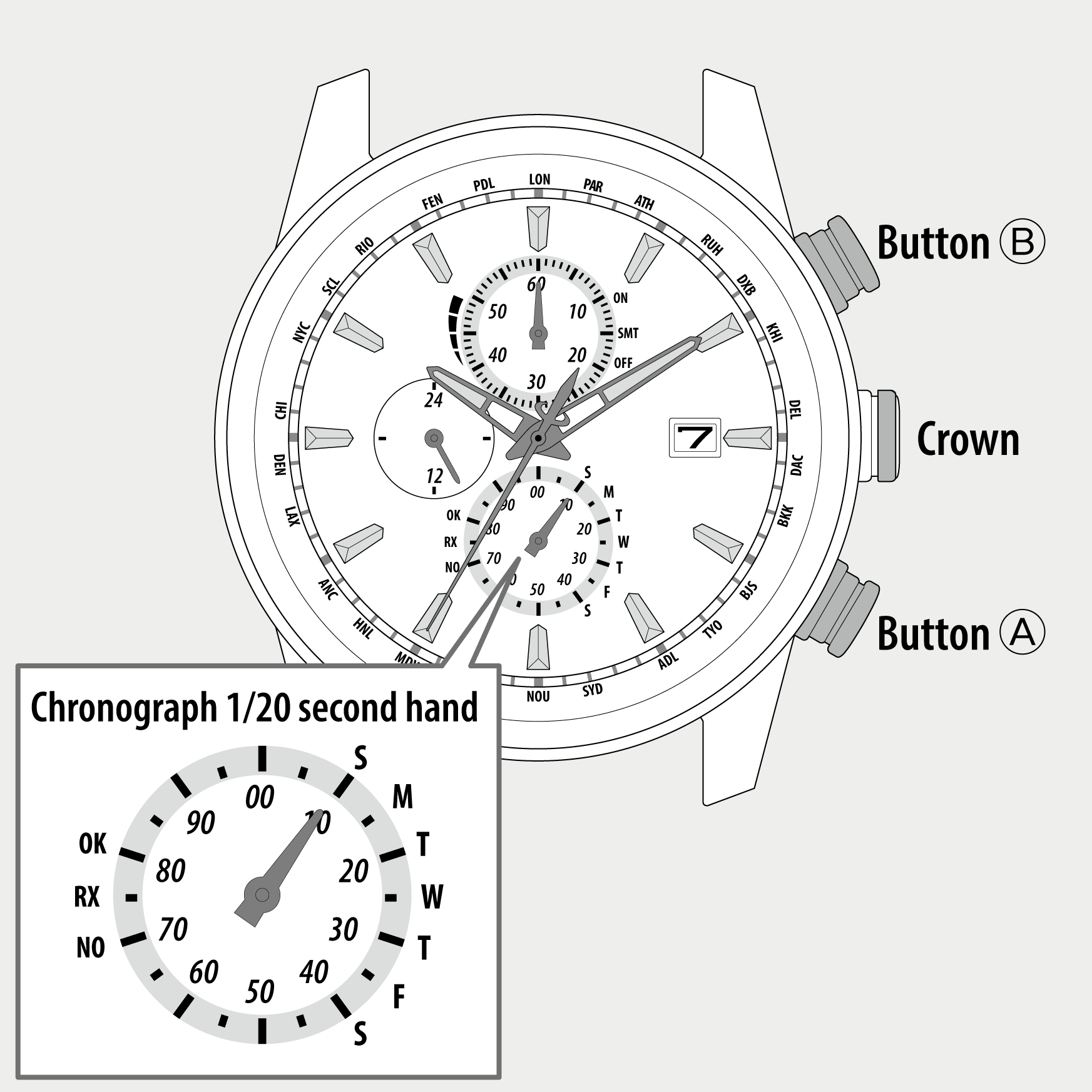 After that, the chronograph 1/20 second hand points to “RX” and signal reception starts.