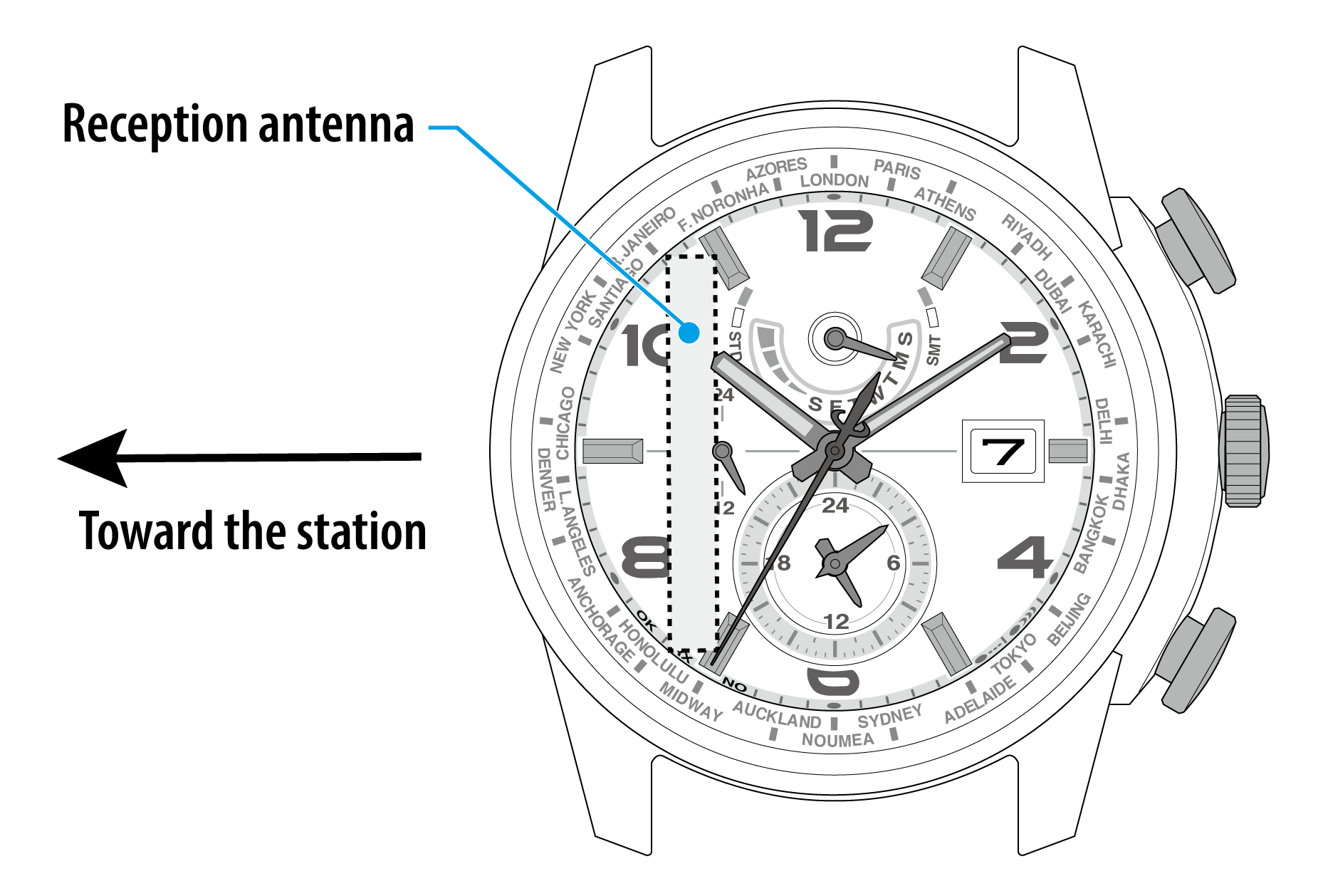 Place the watch with the 9:00 position facing toward the station. - Do not move the watch during time signal reception.