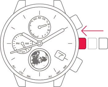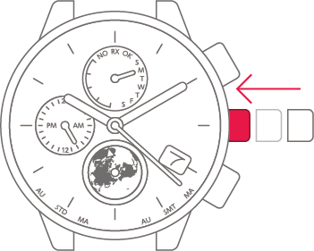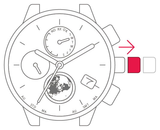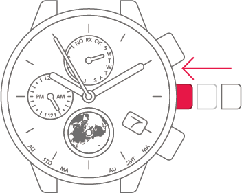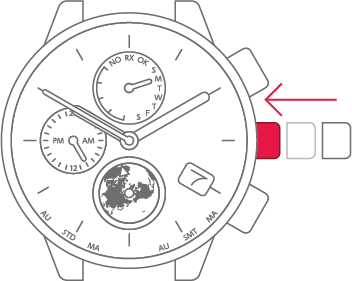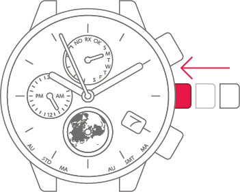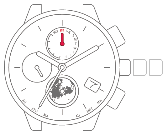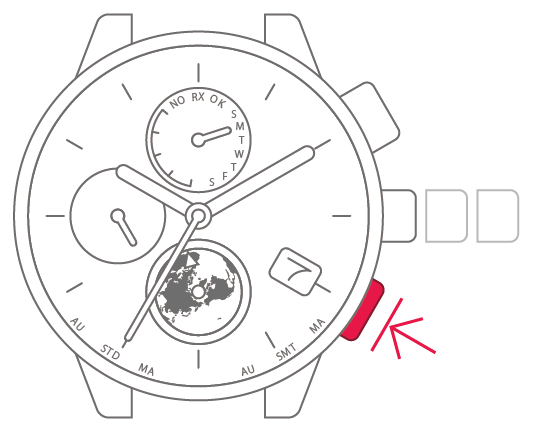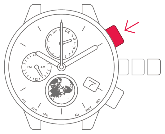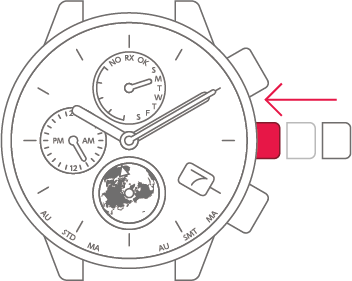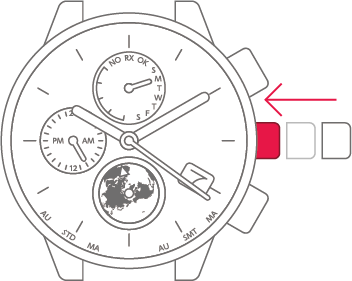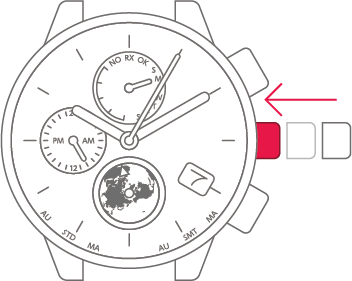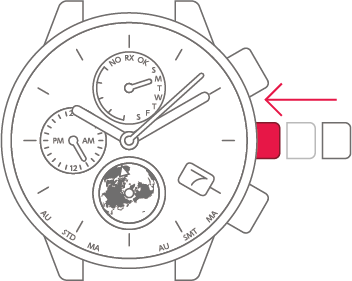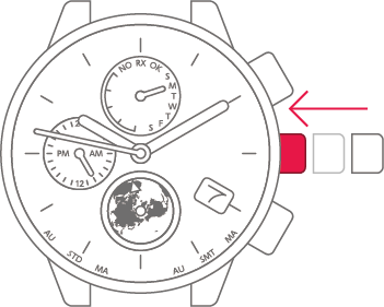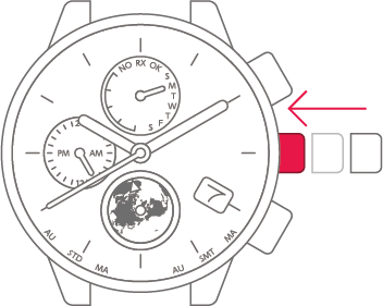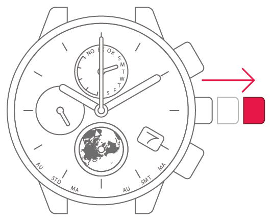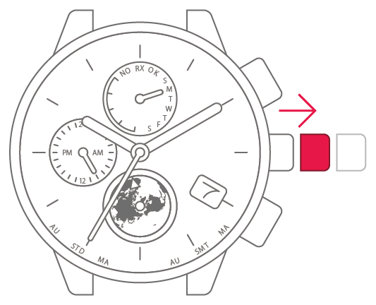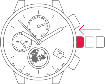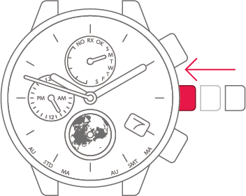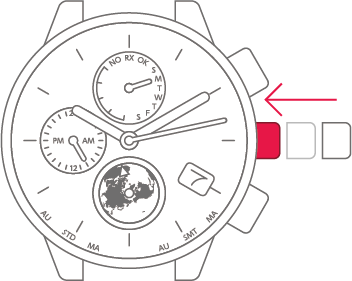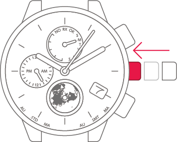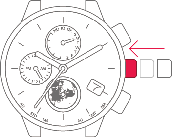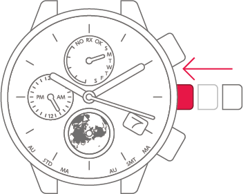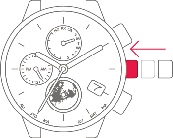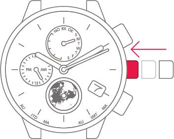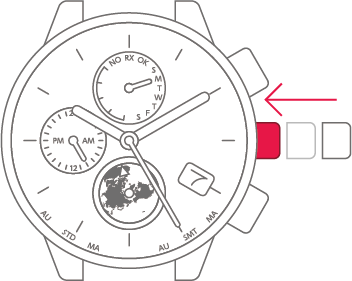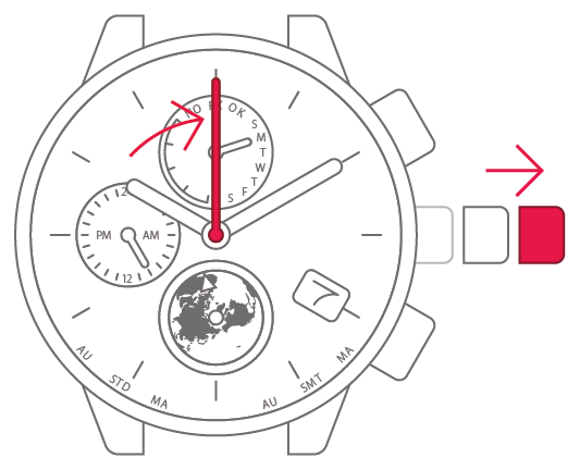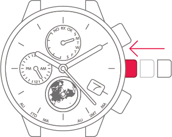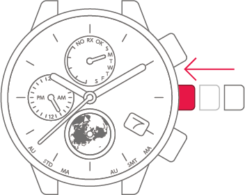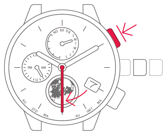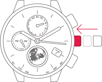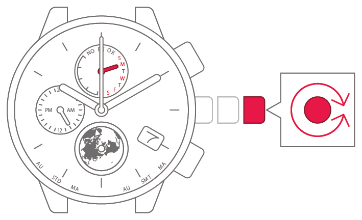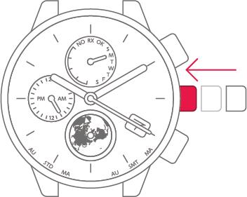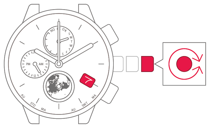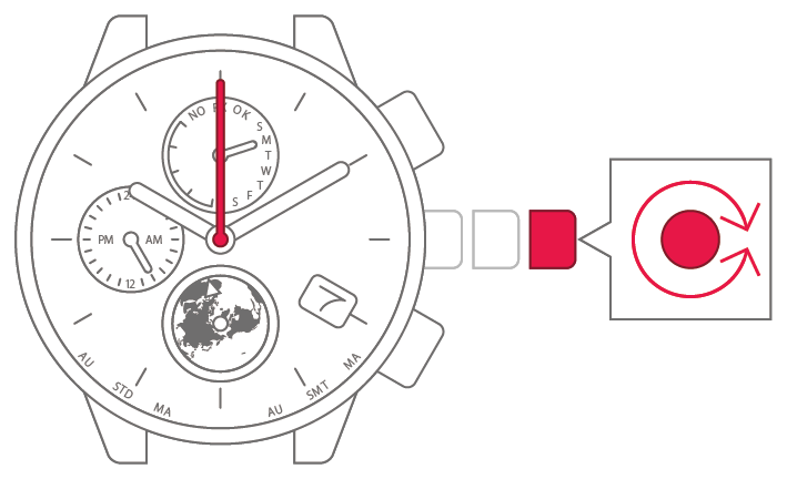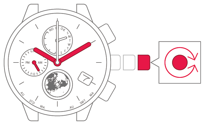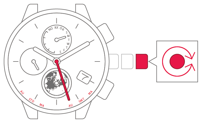| The second hand points to “SMT AU (Auto)” or “SMT MA (Manual)”. | Summer time |
