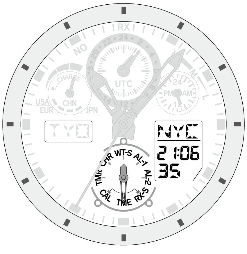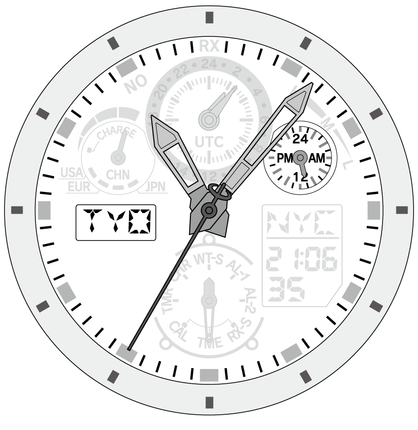 | Analog indication | Time indicated with the hour, minute, second and 24-hour hands, and the digital indication (L). |