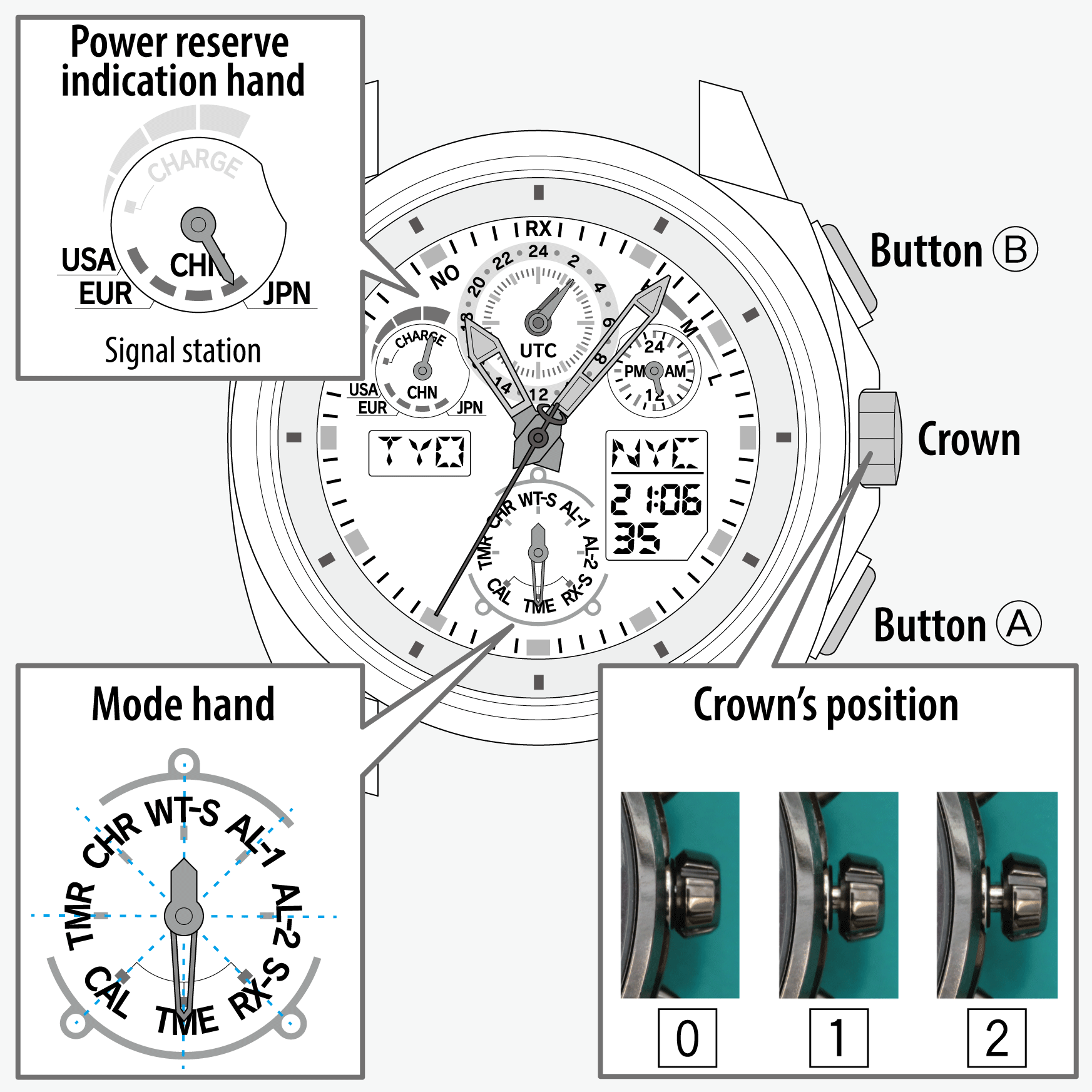 Turn the crown so that the mode hand will point to the center of the mode name securely.
