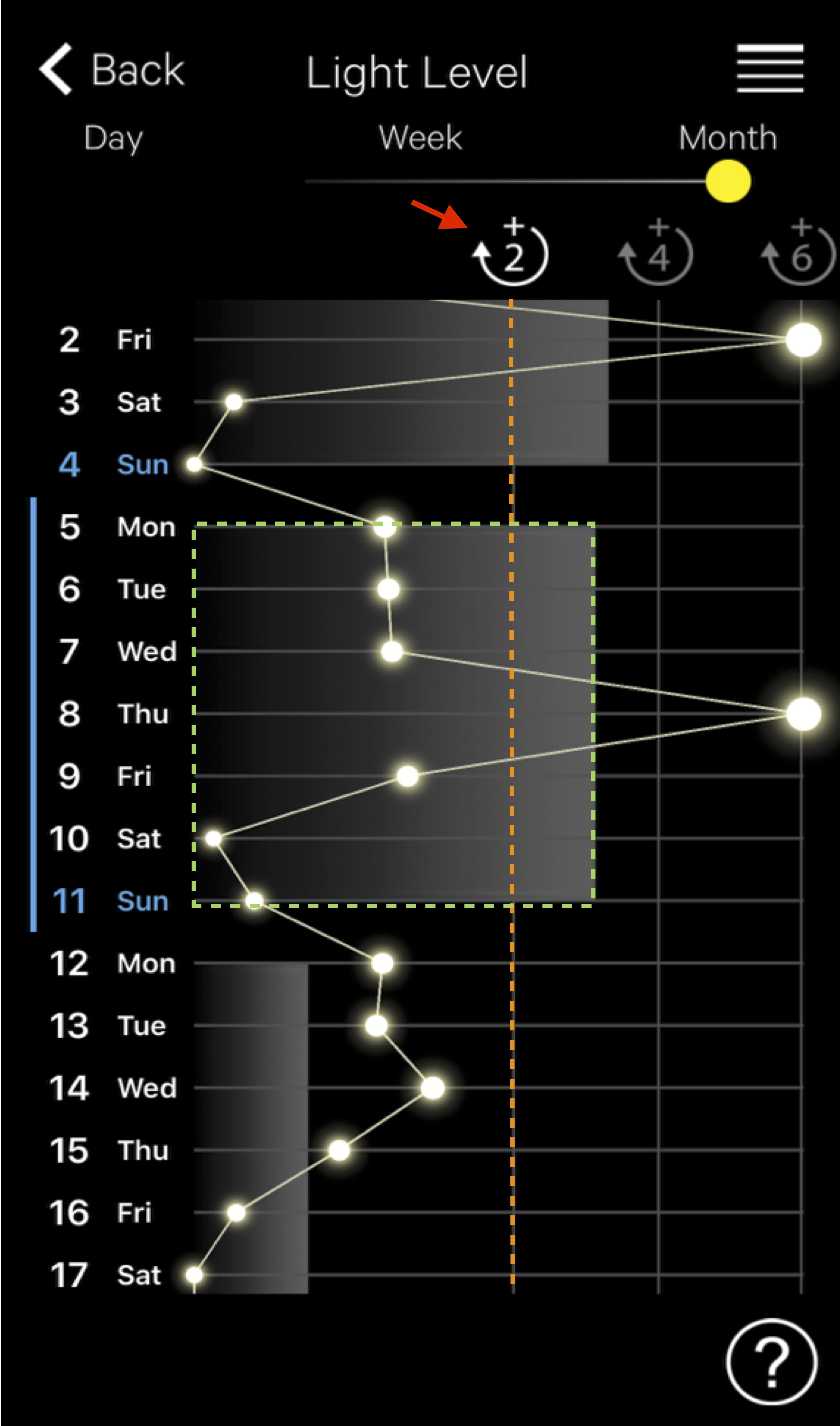 You can see the condition of power generation of the watch in the "Month" of "Light Level" screen of the app.