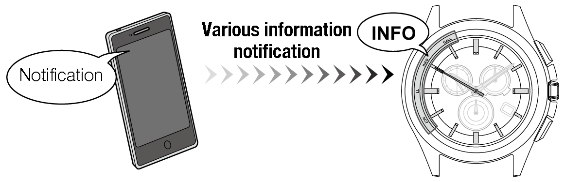 The second hand points "INFO" (50-second position) as the watch receives various info notification.