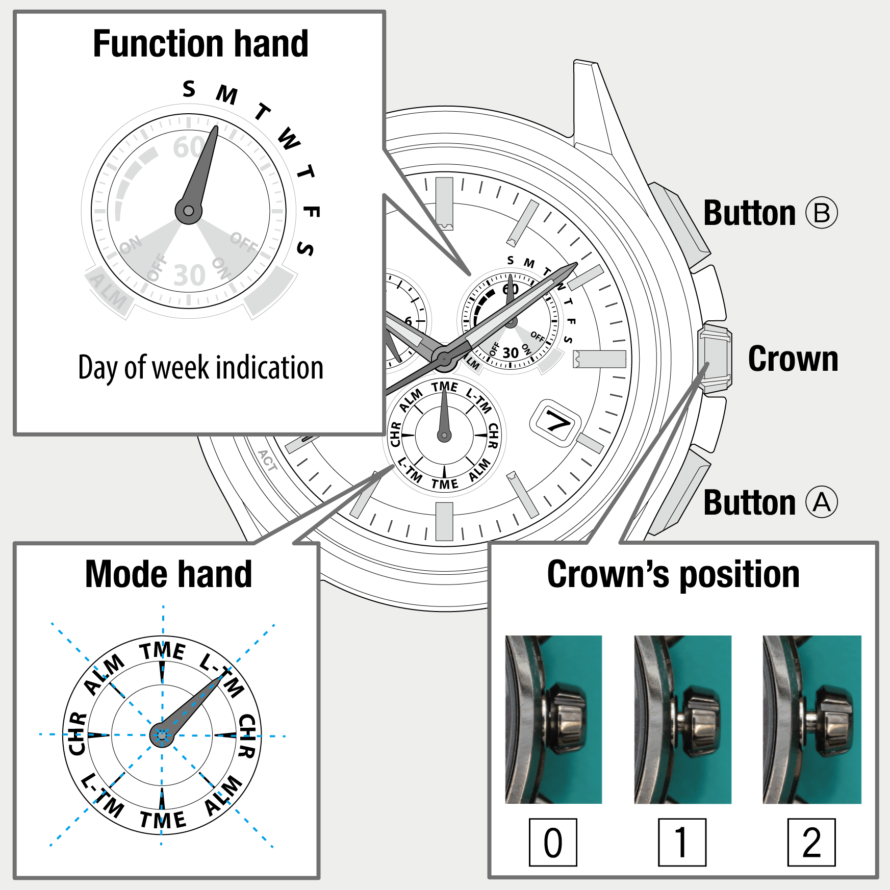 Press the lower right button A repeatedly to indicate day of week when the function hand does not show it.