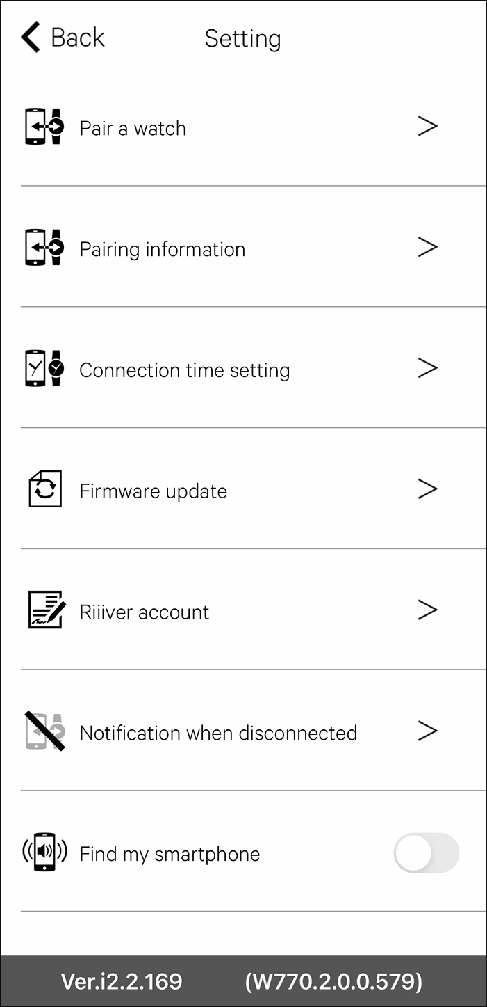 1 Tap “Pair a watch” on the menu screen of the dedicated app of W770 Riiiver and execute pairing following instructions on the screen.