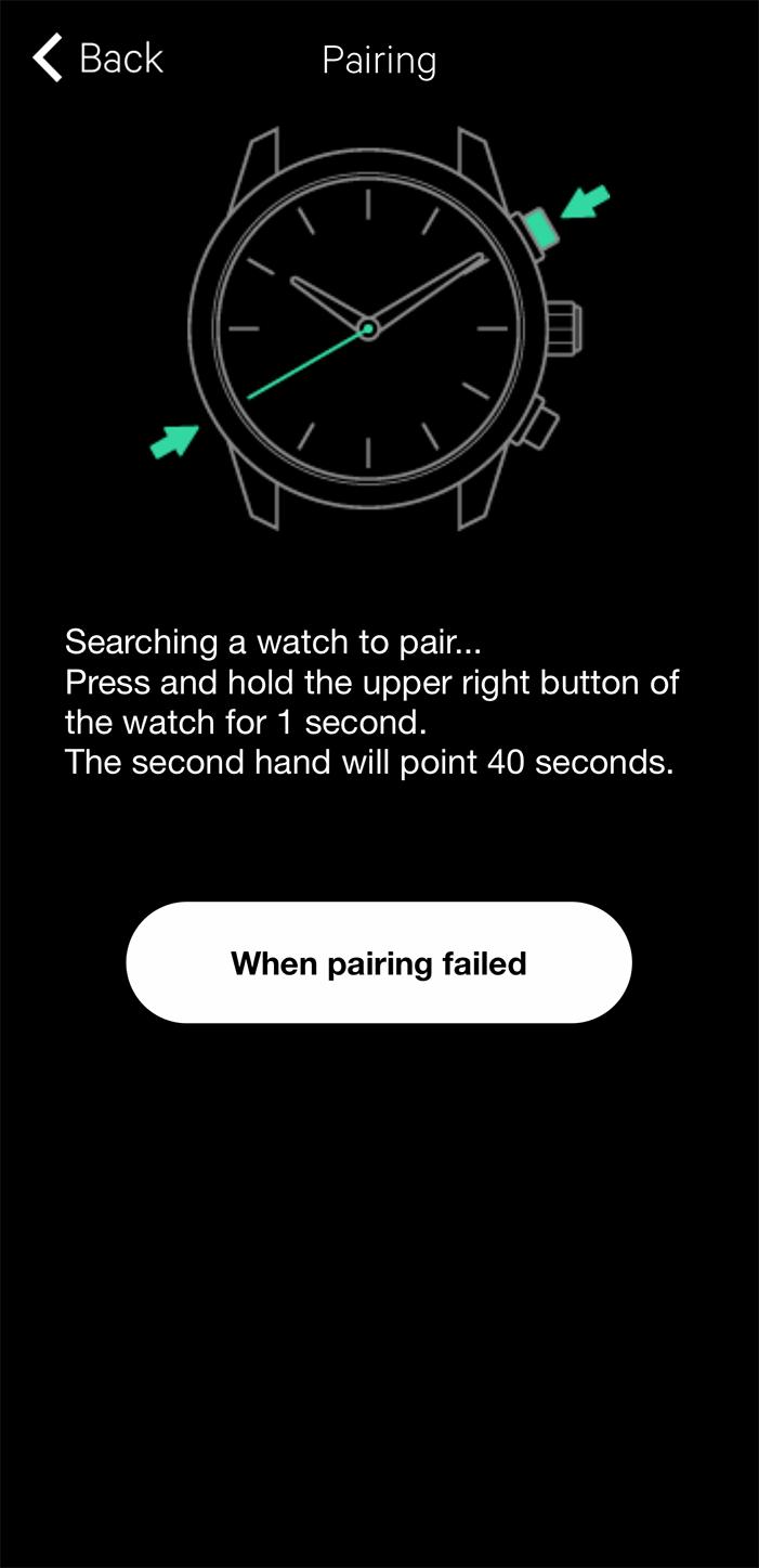 Press the upper right button of the watch following the instructions on the pairing screen of the dedicated app.