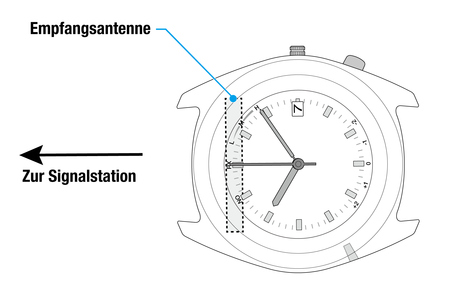 Platzieren Sie die Uhr so, dass die 12:00-Uhr-Position in Richtung Signalsender zeigt. - Bewegen Sie die Uhr während des Zeitsignalempfangs nicht.