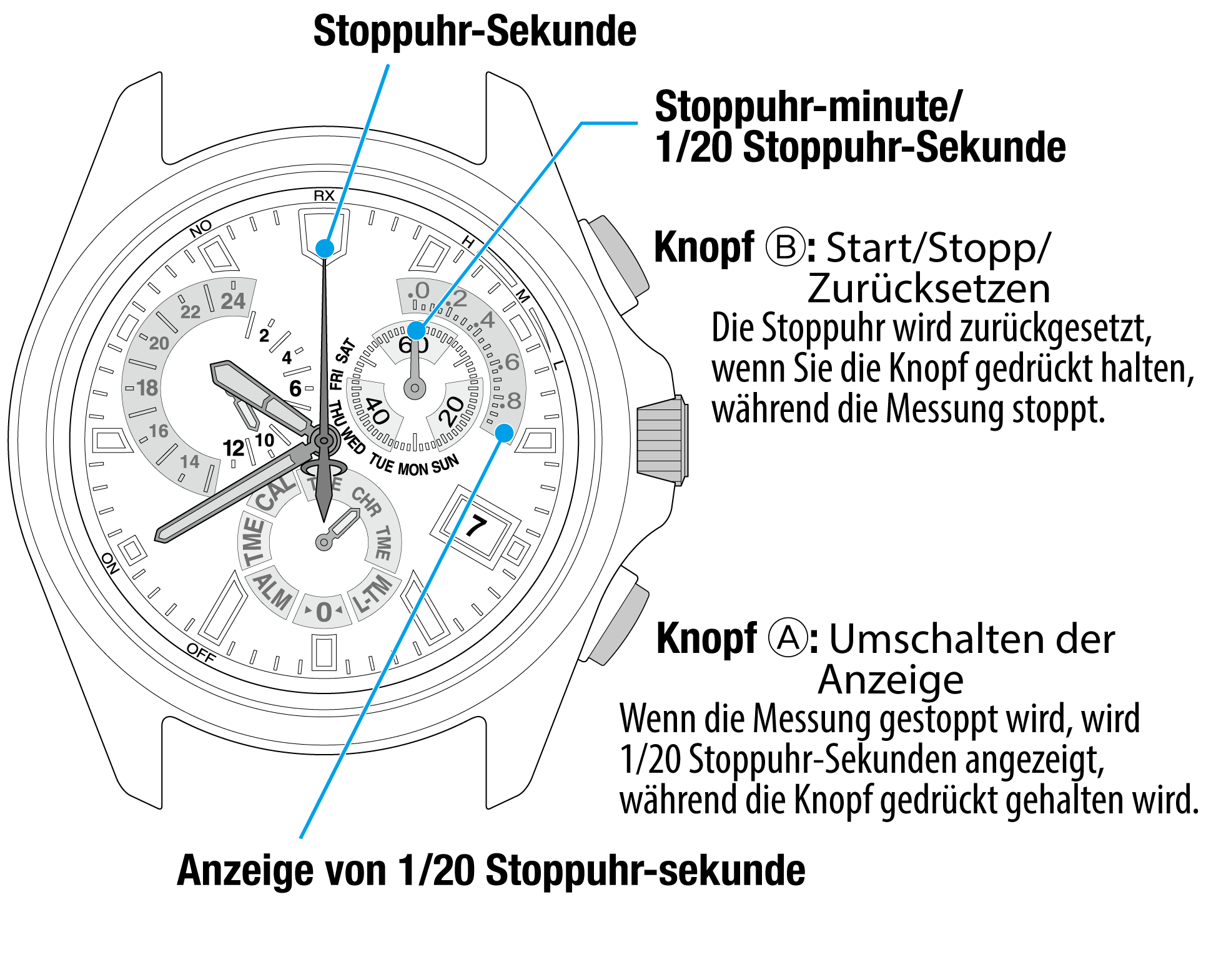 Durch das Herausziehen der Krone wird die Stoppuhr angehalten und zurückgesetzt.