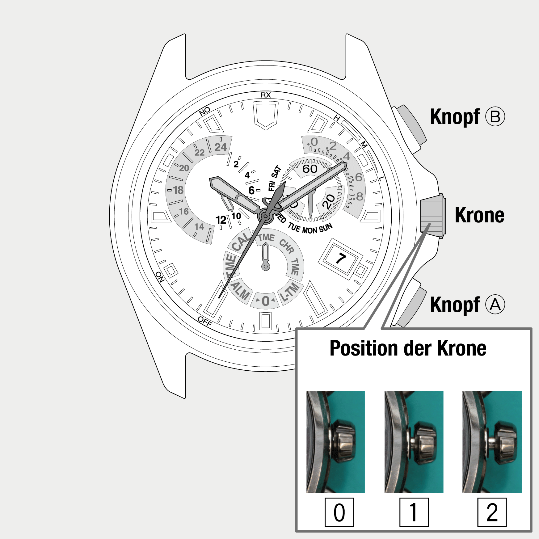 | Die Krone befindet sich nicht in Position 0. | Drücken Sie die Krone in Position 0. |