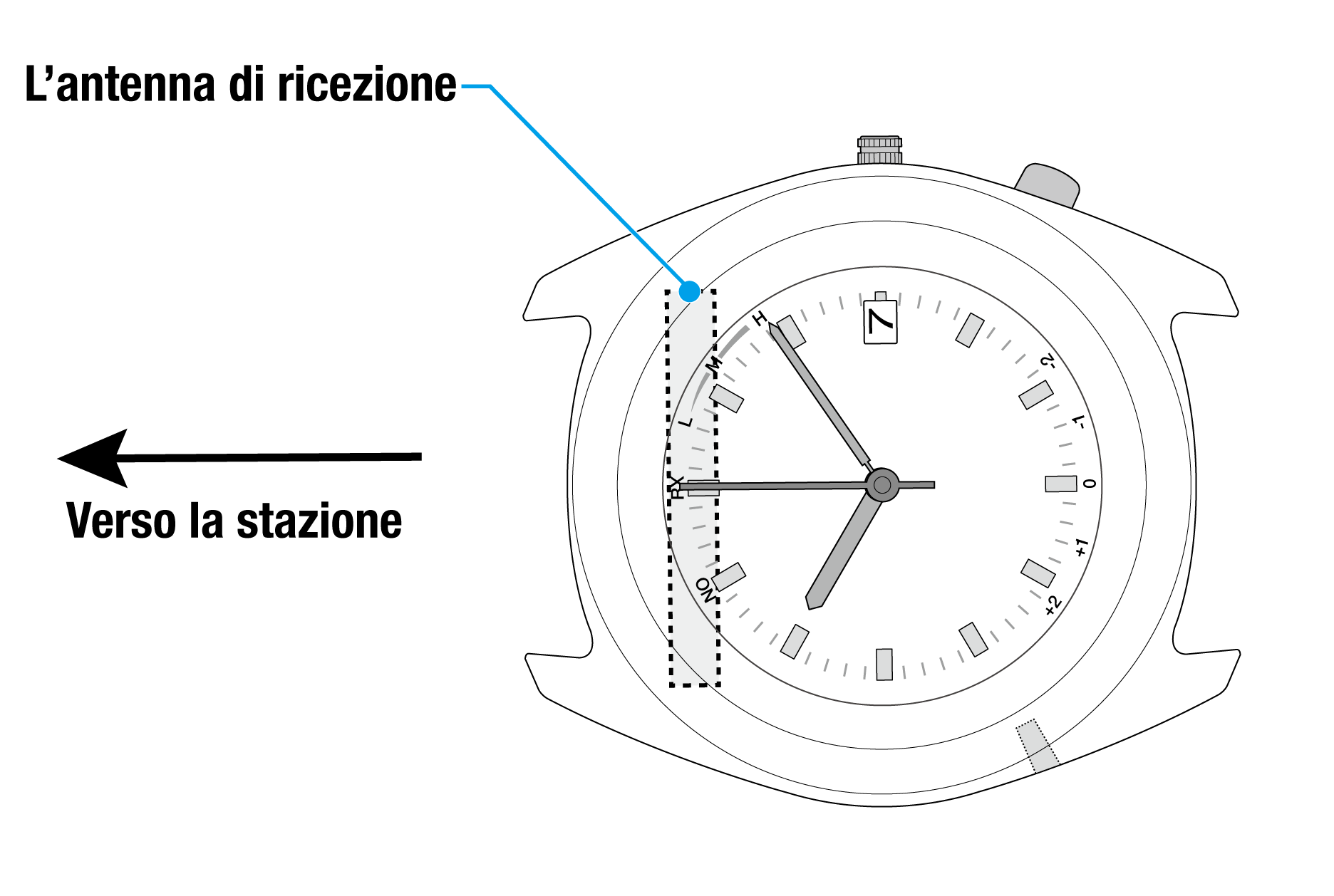 Mettere l'orologio in posizione a ore 12:00, tenendolo rivolto verso la stazione. - Non spostare l'orologio durante la ricezione del segnale orario.