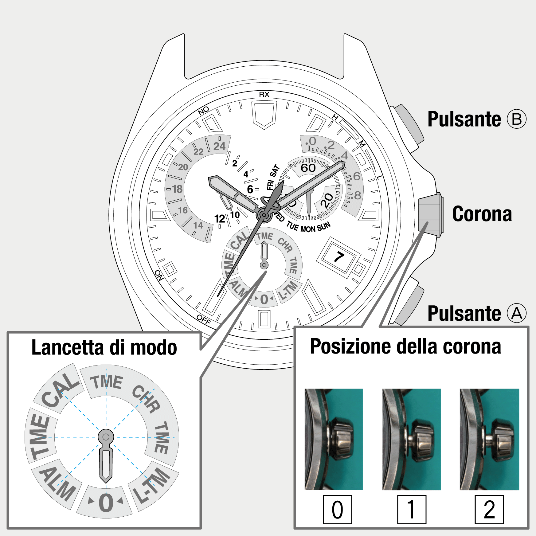 Girare la corona in modo che la lancetta della modalità sia rivolta verso il nome della modalità in modo sicuro.