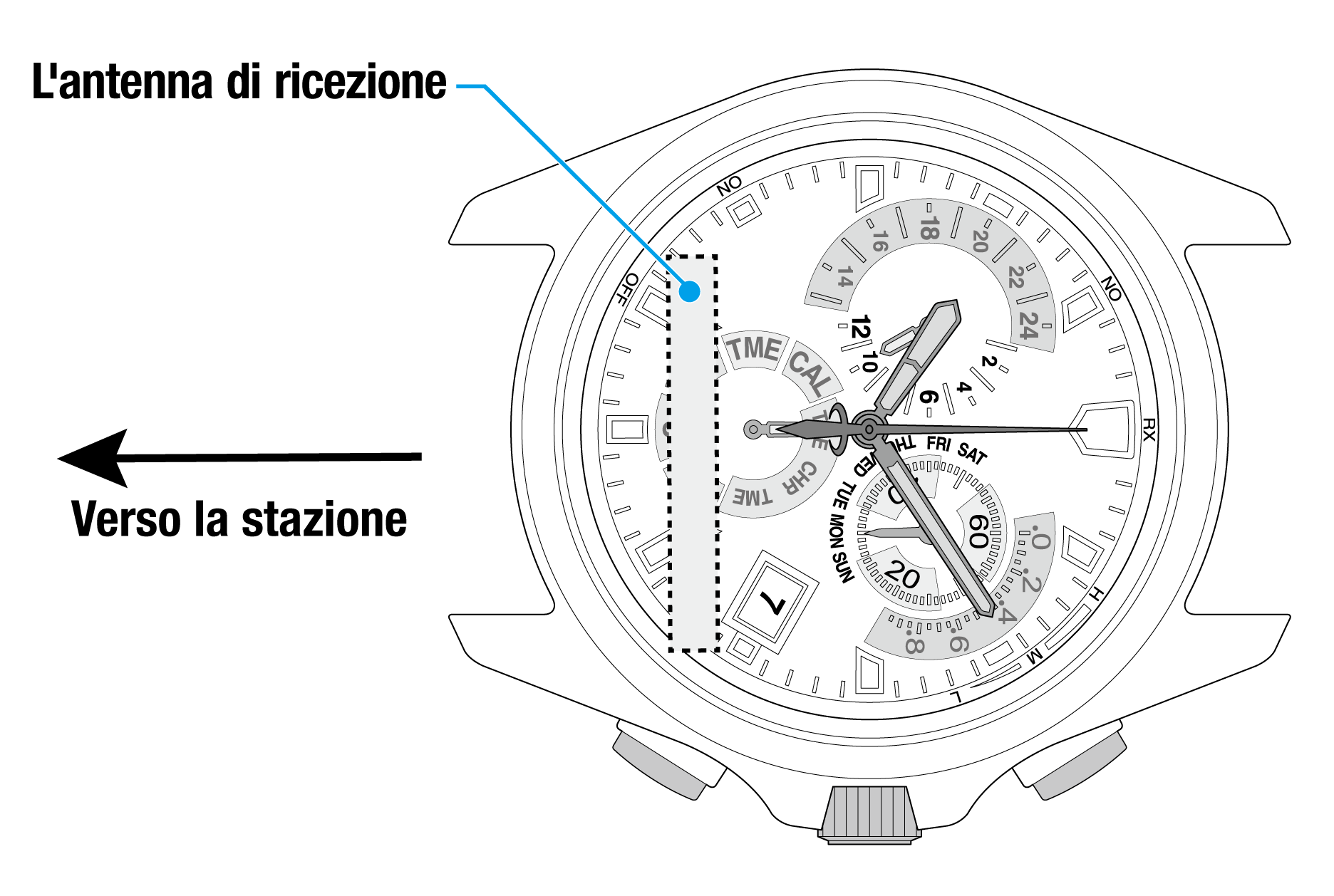 Mettere l'orologio in posizione a ore 06:00, tenendolo rivolto verso la stazione. - Non spostare l'orologio durante la ricezione del segnale orario.