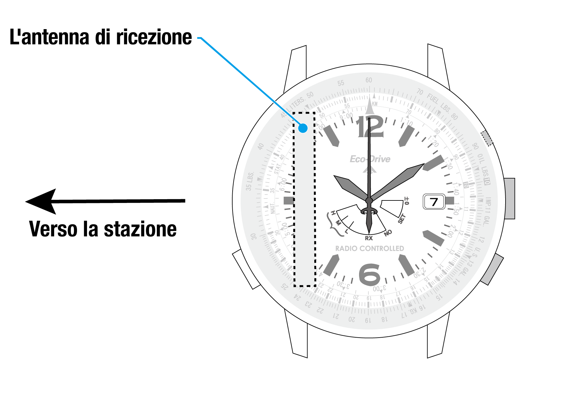 Mettere l'orologio in posizione a ore 09:00, tenendolo rivolto verso la stazione. - Non spostare l'orologio durante la ricezione del segnale orario.