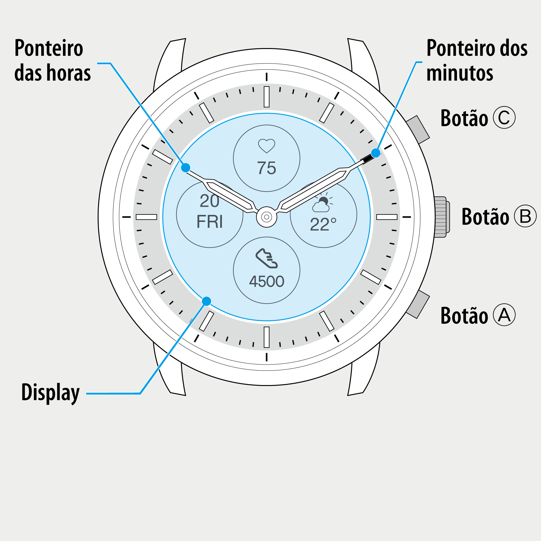 Esse relógio é um smartwatch, que consegue comunicar com um smartphone por meio de Bluetooth.