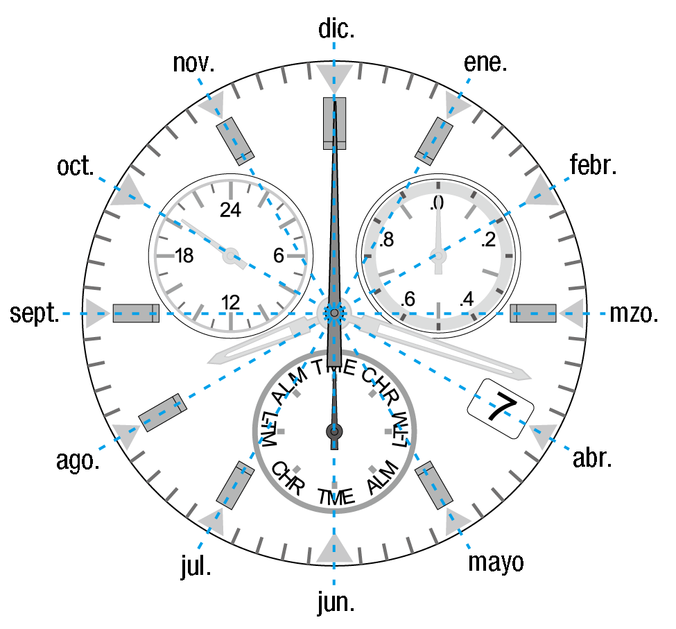 La manecilla de los segundos indica el «mes» y la manecilla de función indica el «año».