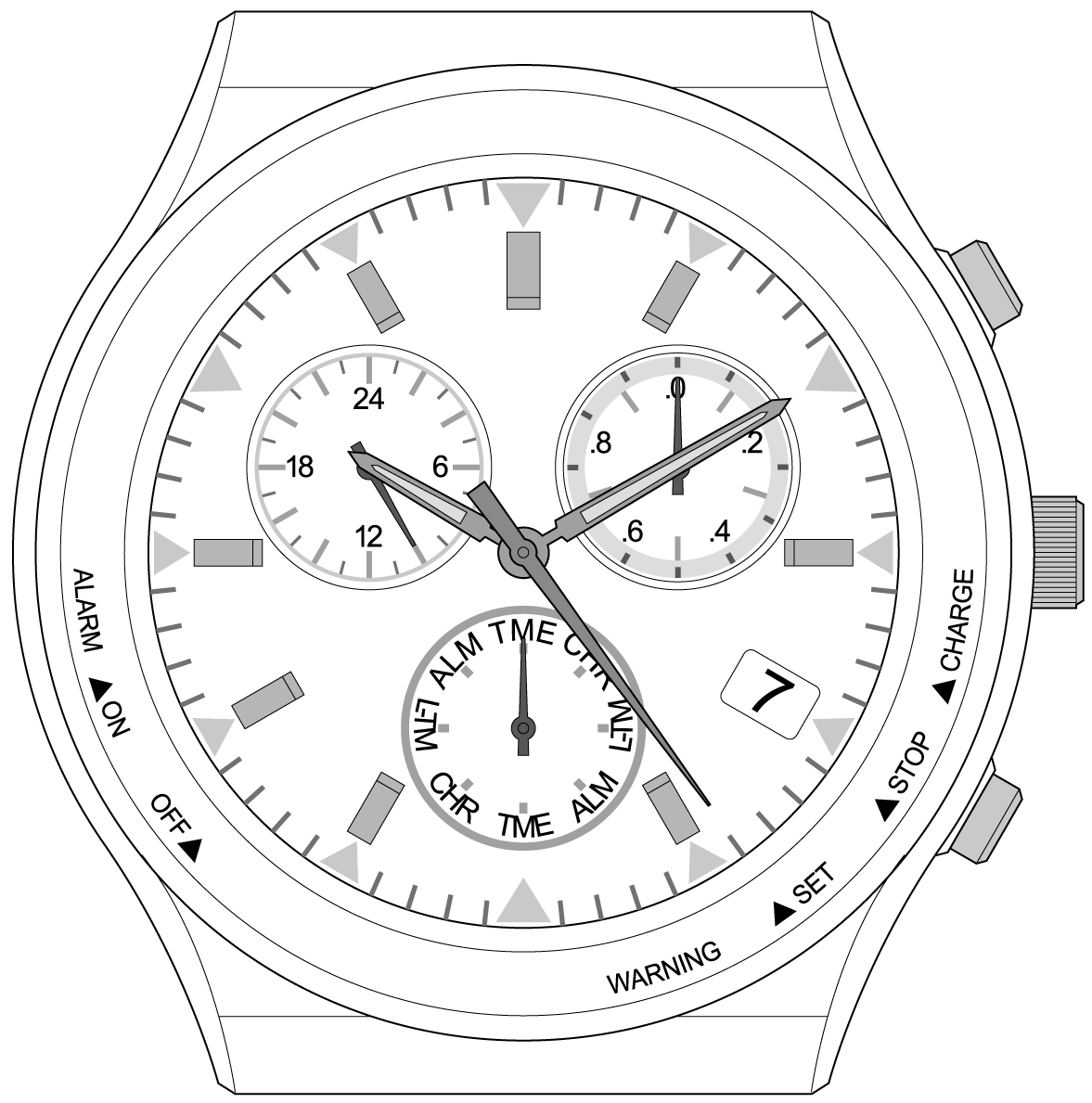 Cargue el reloj y ajuste la hora y el calendario cuando la manecilla de los segundos se detenga y señale SET.