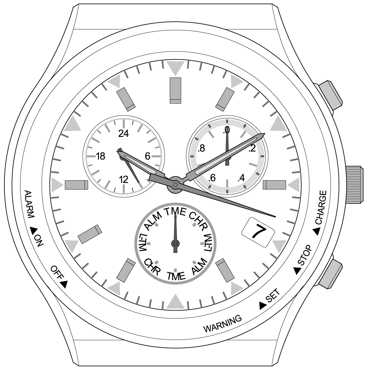 - Cuando han pasado 5 días o más desde que la manecilla de los segundos señaló CHARGE y se detuvo, la manecilla señala STOP y el reloj se detiene por falta de carga.