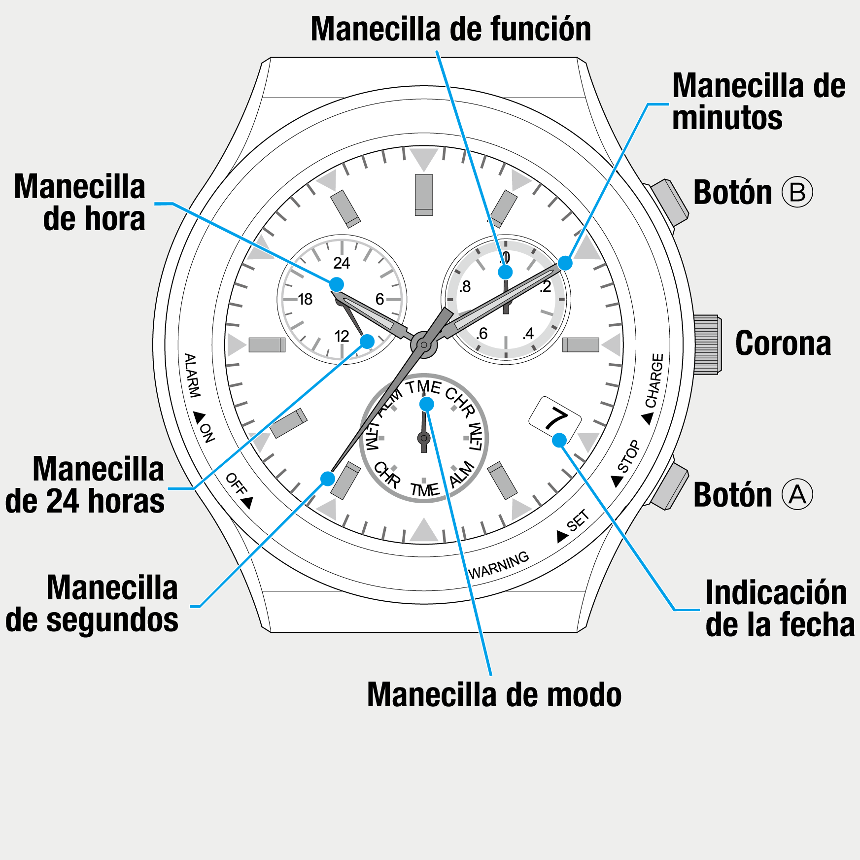 Con la carga suficiente, la manecilla de los segundos señala SET (función de aviso de ajuste horario).