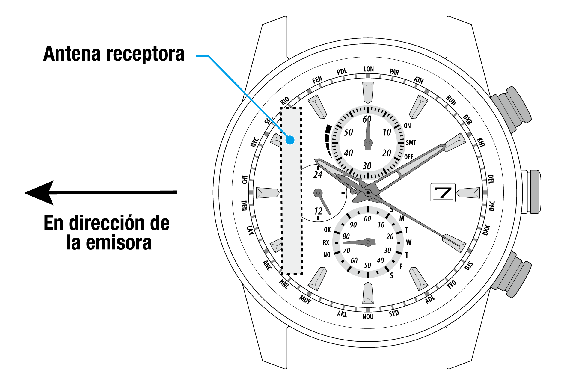 Coloque el reloj con la posición de las 9:00 en dirección de la emisora. - No mueva el reloj durante la recepción de la señal horaria.