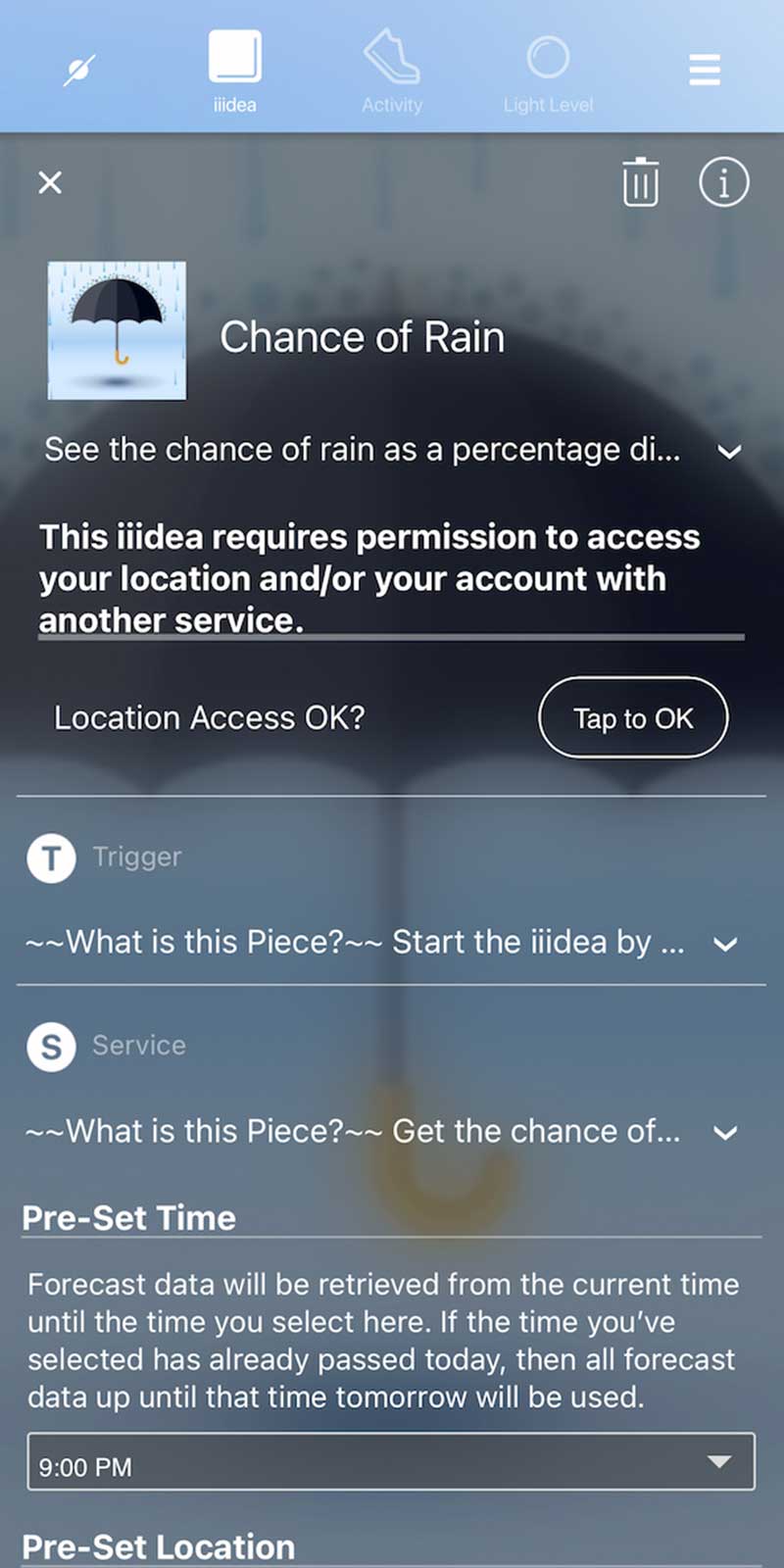 Puede organizar los detalles de configuración para cada una de las iiideas, como el lugar de donde quiere saber el tiempo, la persona a la que quiere enviar un correo, etc.