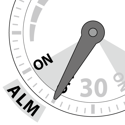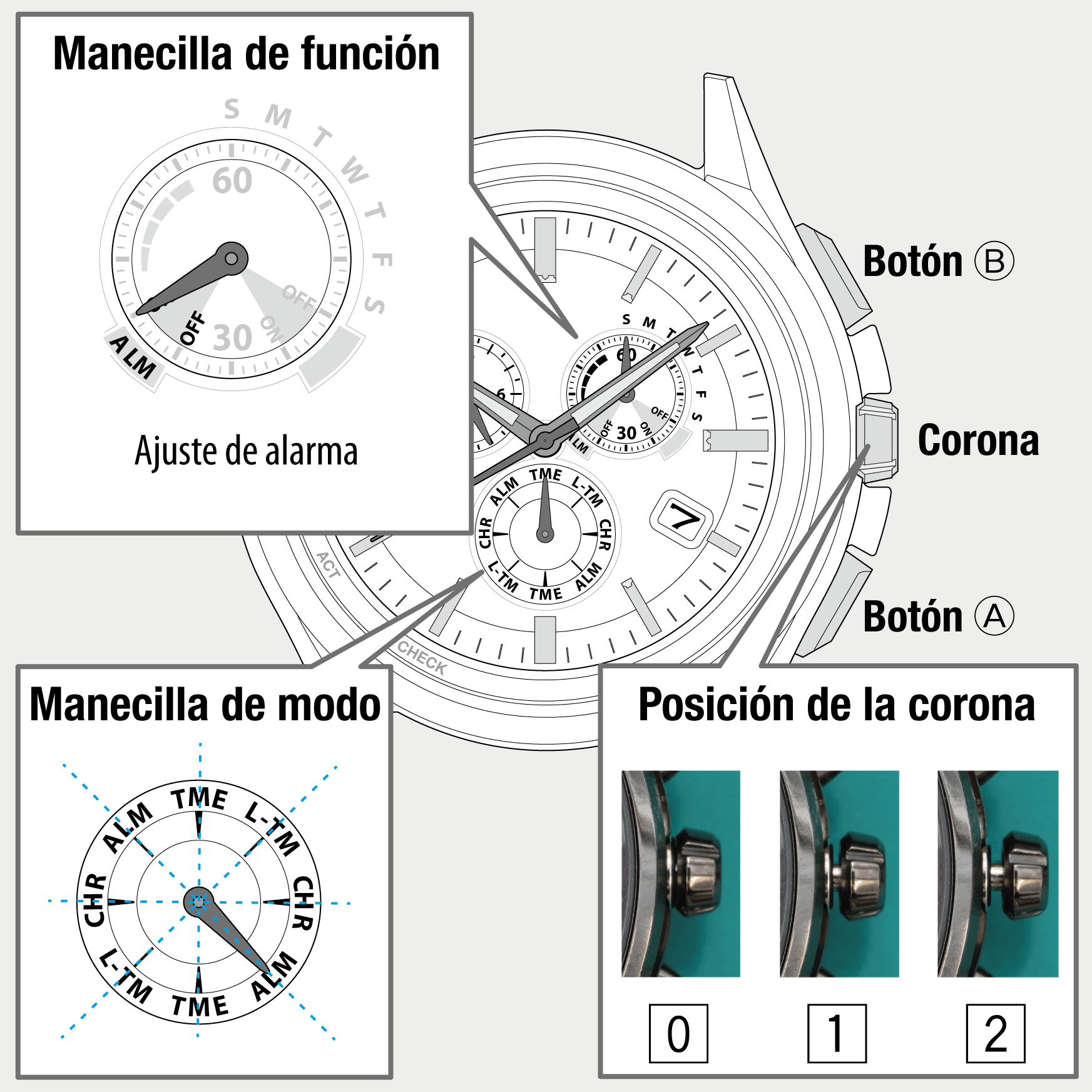 Las manecillas de las horas, minutos y 24 horas indican la hora de alarma establecida en la actualidad y la manecilla de función muestra el ajuste de la alarma (ALM ON/OFF).