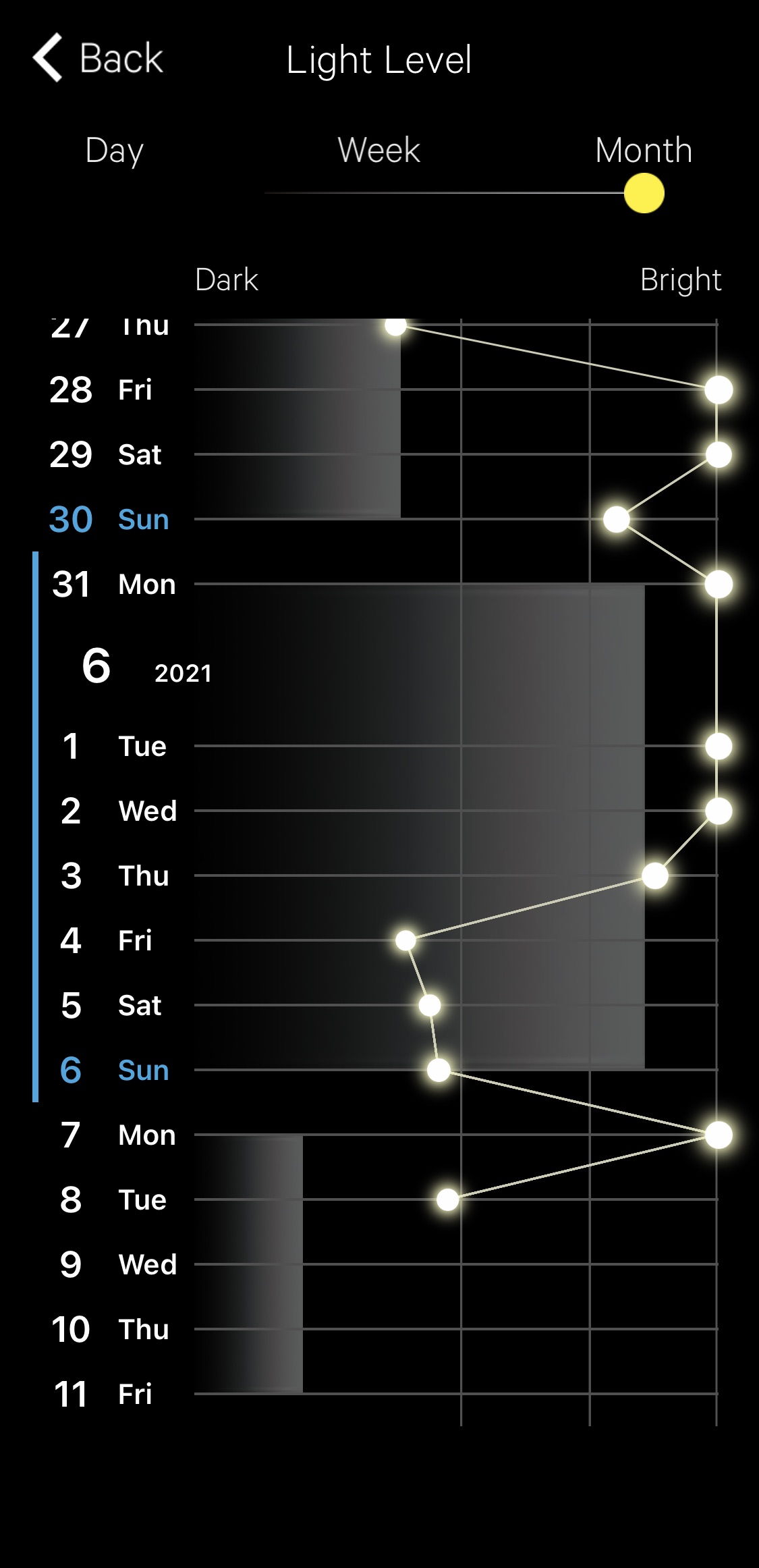 El registro de la cantidad de generación de energía del reloj se puede ver en un gráfico lineal de la pantalla «Light Level».