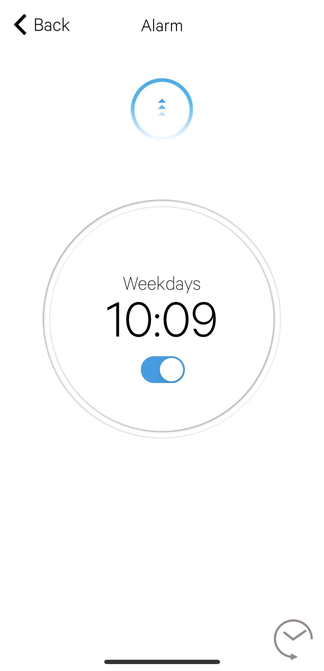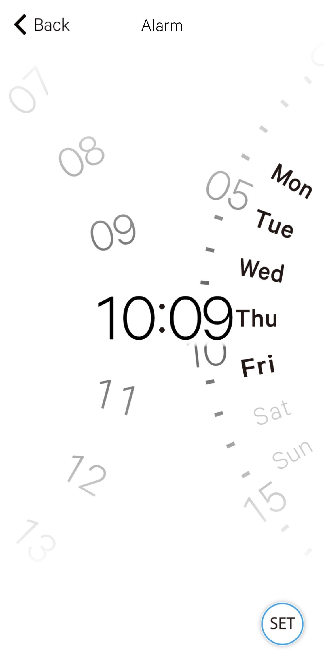 Mueva las esferas arriba/abajo para ajustar la hora de la alarma. Toque los días de la semana en los que desee activar la alarma. |