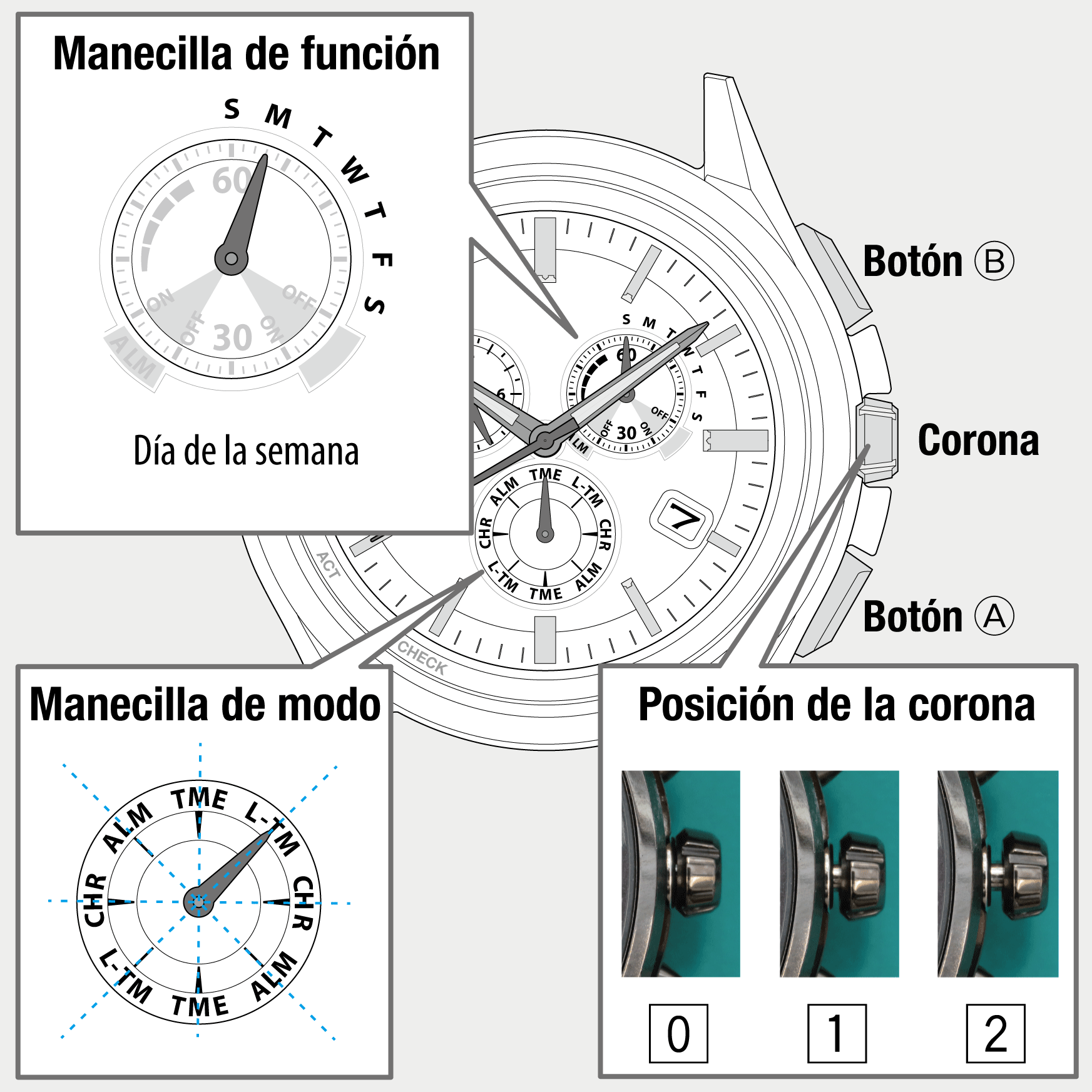Presione el botón inferior derecho A varias veces para indicar el día de la semana si la manecilla de función no lo muestra.