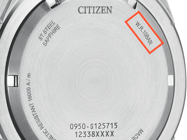 Per controllare la resistenza all'acqua del vostro orologio, osservare il livello di resistenza all'acqua indicato sul quadrante e/o retro della cassa.