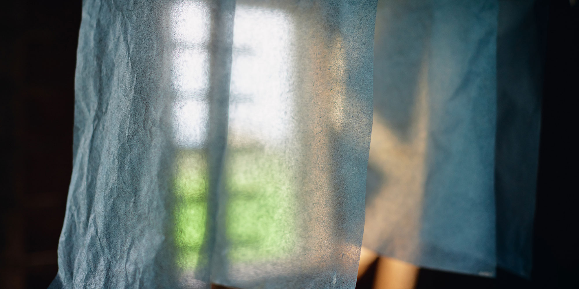 最一開始我認為應該直接染上就好了吧?但是我發現這跟布料完全是不一樣的東西。藍染是要經過浸在染液中,再用水洗的過程,當然和紙破掉的風險會比布料高很多。後來,在不斷嘗試下找到了利用塗上一層薄薄的天然「蒟蒻糊」來加強和紙強度的方法。但是,如果殘留太多「蒟蒻糊」,會產生顆粒或不均勻的狀況,為了找出最適當的比例,我費了不少心思。