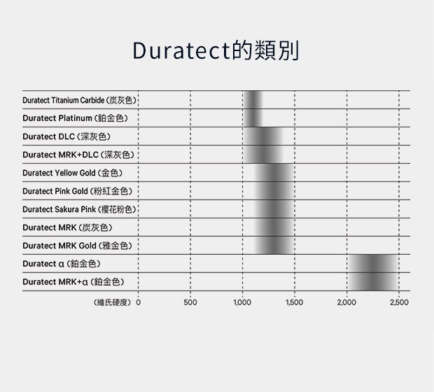 經過數十年的研發,Duratect已發展出11種分類,每個類別具有不同的顏色和硬度。旗艦型號採用了兩種Duratect:Duratect DLC(將應用於HAKUTO-R月球探勘計劃)和Duratect Sakura Pink。